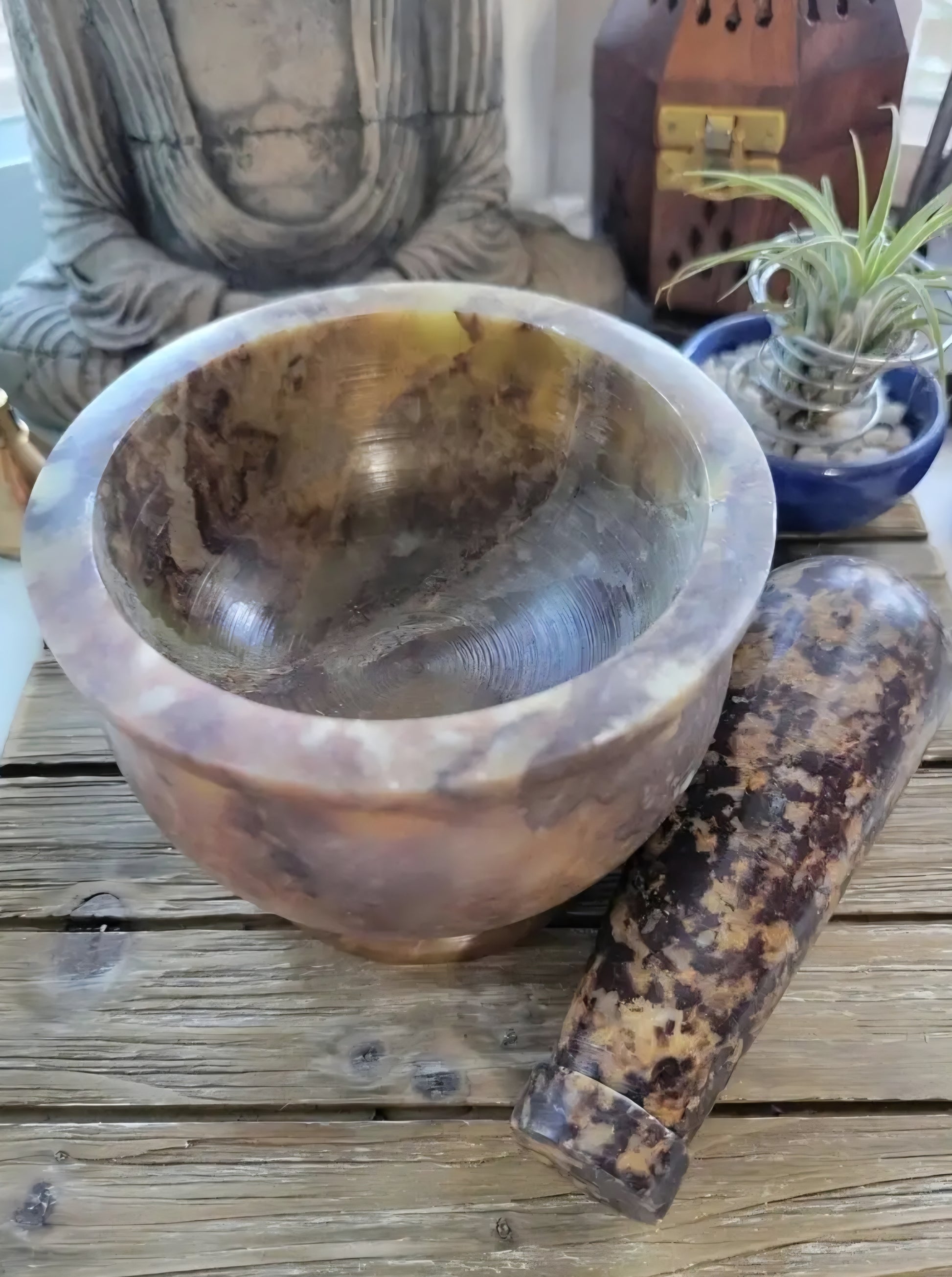Enhance your practice with our beautiful soapstone Mortar and Pestle. Handmade with care, this essential tool grinds or crushes herbs, resins, and more. Unlock the full potential of nature's ingredients with our elegant and durable product.